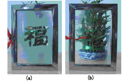 樣品制備實驗中使用的向列相液晶材料是PDLC005(石家莊鹿泉新型電子材料廠提供),其雙折射no=1.517,ne=1.723;使用的預聚合物是30%的環氧樹脂DCL3000,60%聚脂丙烯酸酯MR100,4%鏈轉移劑和4%的光引發劑TPO,2%硫嗡鹽配制成預聚物;將液晶與預聚合物以11的質量百分比混合成液晶膠。使用的玻璃是3mm厚浮法玻璃(河北南玻公司提供);使用的襯墊料微球直徑20m(深圳納微科技公司提供)。將玻璃清洗干凈,在一張玻璃上撒布20m襯墊粉微球,之后蓋上另一張玻璃,兩張玻璃大部分重合,上下留出小部分不重合的臺階邊(方便后續施加應力實驗)。用注射器將液晶膠滴在臺階處下面玻璃上,靠毛細現象使液晶膠充滿在兩張玻璃間重合部分。把夾著液晶膠的兩張玻璃放置于24W紫外燈下進行紫外固化,采用打字復印膠片作為掩膜進行選擇曝光,樣品距離燈約在30cm左右,曝光5分鐘,樣品由固化前透明變成固化后散射毛玻璃, 得到帶有圖案的制品。用不銹鋼方管制作了玻璃框,在玻璃框上安裝了鑰匙孔,擰轉鑰匙就可以方便施加剪切應力,如圖1照片所示。圖1(a)是樣品散射顯示狀態,鑰匙處于豎直位置。圖1(b)是樣品透光消隱狀態,鑰匙處于水平位置。對制品施加剪切應力時,制品變成半透明狀態,字符圖案被消隱不清楚。
