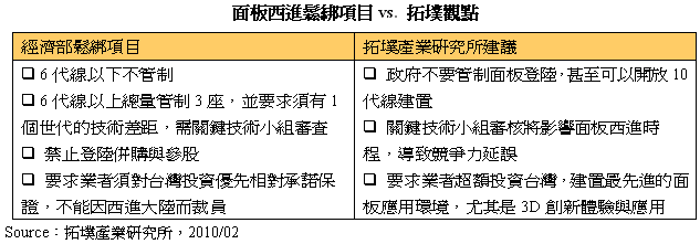 拓墣認為,中國政府發布2010年對臺采購面板金額達55億美元,或否決南韓至大陸投資面板廠等訊息,實際上是希望運用這種高明的談判手法,傳達臺灣面板西進時程若持續延誤,將對臺灣不利的訊息。同時,中國發改委透露高世代面板產線將只發放5張執照,目前僅剩下2個名額;據了解最后申請日期為2月底,時間上確實具有急迫性,面板西進應加速沖刺。