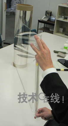而對于與超薄型玻璃底板層疊的方法,則預定將此次的聚酰胺薄膜與與日本電氣硝子30μm和50μm厚的玻璃底板進行層疊,在“nano tech 2010(國際納米科技綜合展,2月17~19日)”上展出。