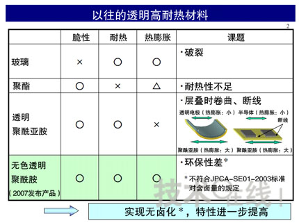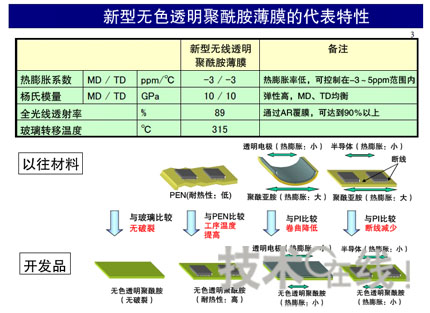 此次的聚酰胺薄膜在用于柔性顯示器底板時,主要有四項優點。第一,由于可用于200℃以上的高溫工序,因此可使透明電極材料經高溫硬化實現低電阻。第二,可支持含有回流焊工序的驅動IC自動封裝處理。第三,由于熱膨脹系數與ITO (氧化銦錫)、阻氣膜、玻璃底板接近,因此制造后的曲翹少。第四,不易破裂。