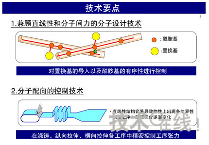 此次,該公司在保持直線性分子結構的同時,降低了聚酰胺的分子間力。對于實現的原因,該公司提到了對分子間的有序性進行控制以及對置換基的種類及配置位置進行控制的手段。另外,還對這些分子進行了無鹵設計(圖5)。