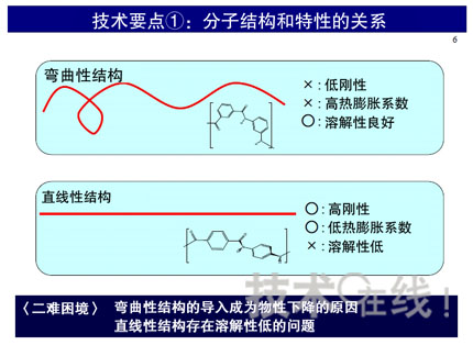 另外,像此次聚酰胺薄膜這樣的高耐熱透明薄膜材料還有經過透明處理后的聚酰亞胺。該公司表示,對原本發黃的聚酰亞胺進行透明處理的分子設計會導致熱膨脹系數變大的問題(圖6)。