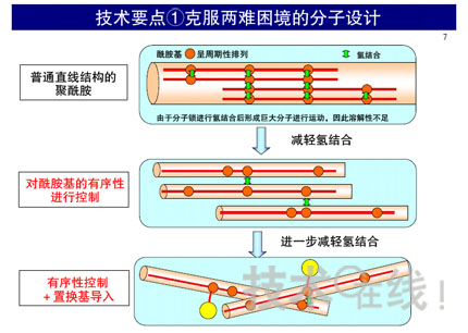 其次還實現了以往聚酰胺所不具備的(4)無色高透明性,以及(5)在超薄薄膜底板上的易成形性。以往聚酰胺難以實現這些要素的主要原因在于分子間力較高。由于這一緣故,此次很難在FPD光學薄膜上使用。因此,該公司通過在分子設計上下工夫,解決了分子間力問題(圖3)。