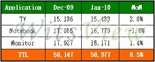 根據WitsView最新大尺寸面板出貨調查,1月份全球總出貨量為5,034萬片,較去年12月微幅成長0.5%,與受到金融風暴影響的去年同期相比則大幅成長125.6%。1月在中國農歷年節假期的帶動下,TV需求持續暢旺,加上液晶監視器面板價格大幅度上漲,下游客戶積極展現庫存回補的力道,使得1月份出貨仍持續成長。