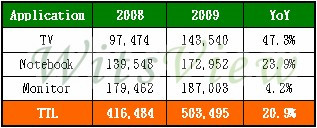 以各應用別而言,2009年展現了強勁的爆發力,尤其是受惠于中國大陸內需市場強勁的需求,液晶電視面板出貨量自2009年一月起逐月成長并屢屢創下新高;筆記型計算機則受惠于windows7的上市,品牌新機帶動面板出貨量增長;至于液晶監視器由于08年下半年下游客戶憂心金融風暴所帶來的沖擊,嚴格管控庫存水位,2009年第一季強勁的庫存回補力道,加上市場需求回溫,2009年出貨同樣呈現成長的走勢。