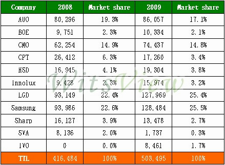 就各面板廠出貨片數的市占比重方面,2009年以韓廠三星(Samsung)和LGD拔得頭籌,分別以25.5%和25.4%位居冠軍和亞軍,兩家市占總和達到50.9%,領先臺廠的42.3%,其中友達(AUO)和奇美(CMO)市占分別為17.1%和14.8%。