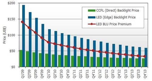 2009年Q1--2013年Q4 40寸全高清液晶電視面板用CCFL與LED背光板價格趨勢