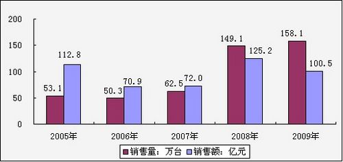 2009年,等離子電視產品登上了“家電下鄉”的快車,等離子電視絢麗的影像效果和其更為消費者所接受的價格,使中國等離子電視市場得到一定程度的發展。2009年中國市場等離子電視銷售量為158.1萬臺,同比增長6.0%,銷售額為100.5億元,同比下降19.7%。出現“量升額降”的情況可以歸結為大尺寸等離子電視的價格下降和其市場份額增加。