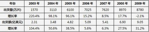 表1 2003-2009年全球OLED產業出貨水平及增長率