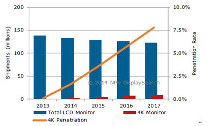由于生產成本下降導致平均銷售價格(ASP)下跌,以及在消費與商用市場的采用增加,超高清(UHD)4K臺式電腦顯示面板出貨量預計將穩步增長。根據NPD DisplaySearch臺式電腦顯示器出貨量及預測最新季度報告Quarterly Desktop Monitor Shipment and Forecast Report表明,雖然臺式電腦顯示器總出貨量將于2014年下降至1億3,300萬臺,但4K UHD顯示器的出貨量將達到200萬臺,到2017年預計將占到出貨總量的8%。4K顯示器的平均銷售價格將從2014年的$1,347下跌至2017年的$927。