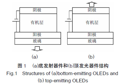 有機電致發光器件(OLEDs)以其亮度高、視角寬、功耗小、響應快和成本低等優點引起全球范圍內的研究熱潮[1],被業界公認為是取代液晶顯示器的新一代顯示技術。按光從器件出射方向的不同,OLEDs 主要分為兩種不同的結構:一種是底發射器件(圖1(a)),另一種頂發射器件(圖1(b))。有源驅動有機發光器件(AM-OLED) 是未來制備大尺寸、高清晰度有機顯示設備的研發重點之一,它要求OLEDs 器件要與薄膜晶體管(TFT)配合使用。這樣一來,從底發射器件中發出的光只能部分地從驅動面板上設置的開口處射出,大部分發光都被浪費,開口率較低,僅為30%~ 50%。而且隨著清晰度的提高,開口率還會降低,一般來說,對于圖像分辨率大于300 ppi 的顯示設備開口率會降到10%以下[2]。而在頂發射器件中,光從器件的頂部出射則不受TFT 的影響,因此能有效提高開口率,理論上可達100%[3],有利于器件與電路的集成。而且頂發射器件還具有提高器件效率、窄化光譜和提高色純度等優點[4-7]。彩色(se)(se)顯(xian)示(shi)是衡(heng)量(liang)顯(xian)示(shi)器(qi)是否在市場上具(ju)有(you)競爭力的(de)重要標志。OLEDs 實現(xian)(xian)彩色(se)(se)化通常有(you)下面三種方法(fa):紅綠(lv)藍(RGB)像素獨立發光(guang),白光(guang)器(qi)件結合(he)彩色(se)(se)濾光(guang)片和光(guang)色(se)(se)轉換。其中,白光(guang)器(qi)件結合(he)彩色(se)(se)濾光(guang)片的(de)方法(fa)是業內公認的(de)實現(xian)(xian)全彩色(se)(se)顯(xian)示(shi)最簡單的(de)方法(fa),能有(you)效解決RGB像素金屬蔭罩對(dui)位精度的(de)問(wen)題。