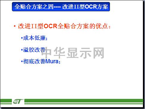 近日,深圳(zhen)平板顯(xian)示行業協會(hui)組織了(le)參觀易天自動(dong)化設備有(you)限(xian)公司(si)的(de)會(hui)員單(dan)位參觀活動(dong)。其中深圳(zhen)市中顯(xian)微電(dian)子有(you)限(xian)公司(si)副總裁(cai)姚伏恒發表(biao)了(le)《全貼合技(ji)術的(de)進展》的(de)演(yan)講報告。以下為其演(yan)講報告PPT部分內容(rong),詳情(qing)請關注中華顯(xian)示網與《國際光電(dian)與顯(xian)示》雜(za)志2015年2、3刊。