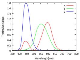 根據CIE標準,人眼對光以及顏色的視覺響應曲線如下圖所示,、