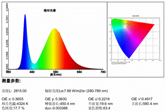 此外,該光譜輻亮度計可滿足顯示屏上不同測量區域大小的切換以及不同產品的測量要求;測量速度極快,可以以毫秒級測量速度實現整個光譜范圍的測量;現場測量還可采用WIFI,方便分享實時數據,應用靈活。圖9是其對顯示屏的典型測試報告,通過一次測量即可以得到顯示屏的亮度、光譜數據、色品坐標、主波長、相關色溫等參數,在三基色信號下分別進行測量后軟件即可自動計算色域覆蓋率等參數,評價參數全面。