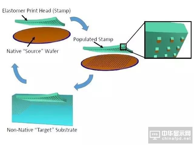 μTP技術,簡單的來說,就是使用彈性印模(stamp)結合高精度運動控制打印頭,有選擇的拾取(pick-up)微型元器件的陣列,并將其打印(printing)到目標基板上。