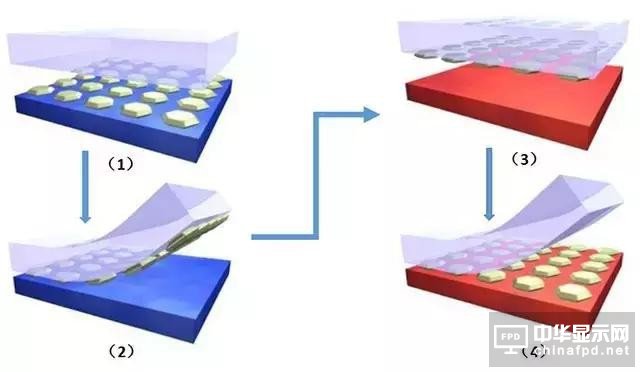 微轉印工藝流程:圖1:彈性印模接近晶圓;圖2:彈性印模拾起芯片;圖3:彈性印模接近目標基板;圖4:印模將芯片“印刷”(放置)在目標基板上