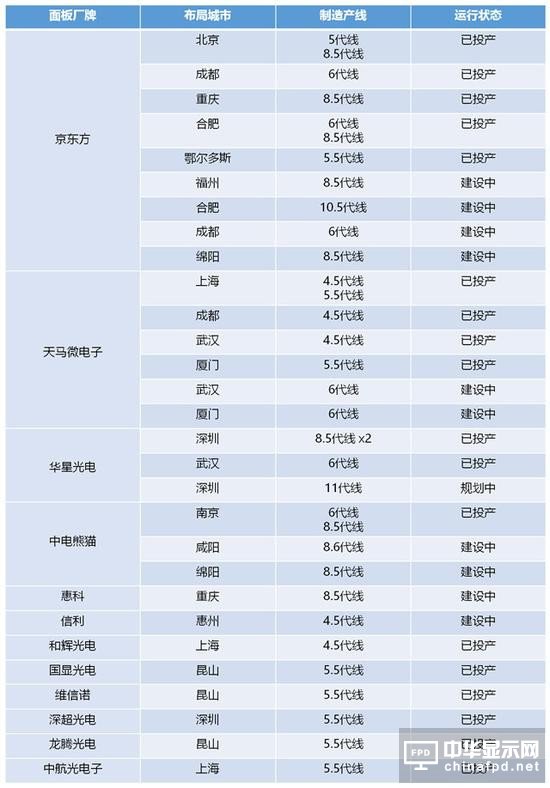 中國顯示(shi)面板企業的品牌及擁有(you)代線對應情況