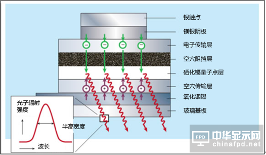 因為(wei)沒有背光(guang)源,QLED的結構原理非常簡單。其發(fa)光(guang)中心是由硒化鎘(CdSe)納米晶(jing)體組(zu)成的量子(zi)(zi)點(dian),量子(zi)(zi)點(dian)層(ceng)夾(jia)在電(dian)子(zi)(zi)傳(chuan)輸(shu)和(he)空(kong)穴(xue)傳(chuan)輸(shu)有機(ji)材(cai)料層(ceng)之間,外加電(dian)場使(shi)電(dian)子(zi)(zi)和(he)空(kong)穴(xue)移動到量子(zi)(zi)點(dian)層(ceng)中,它們(men)在這里被捕獲到量子(zi)(zi)點(dian)層(ceng)并且重組(zu),從而發(fa)射光(guang)子(zi)(zi)。