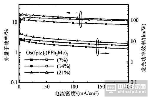 (fptz)2Os ( PPh2Me)2制作紅(hong)色磷光OLED的發(fa)光功(gong)率效(xiao)率與電(dian)流密度關系(xi)圖
