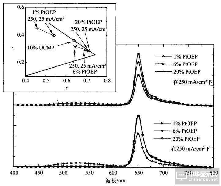 另外中國科學院長春應用化學研究所馬東閣(ge)與武漢(han)大(da)學楊楚(chu)羅曾采用了一新的(de)主體材(cai)料O-CzOXD真空蒸鍍制(zhi)作(zuo)了紅(hong)色磷光(guang)OLED,其最高(gao)?ext 被提(ti)升到(dao)18.5%。同樣(yang)的(de)進展也發生在之前Cannon所報道的(de)Ir(4F5Mpiq)3上:Yang Yang以濕法工(gong)藝制(zhi)作(zuo)ITO/PEDOT: PSS/PFO:Ir(4F5Mpiq)3/CsZ C03 /Al OLED,最高(gao)?P從原來(lai)的(de)12.4 lm/W提(ti)高(gao)到(dao)17.6 lm/W。