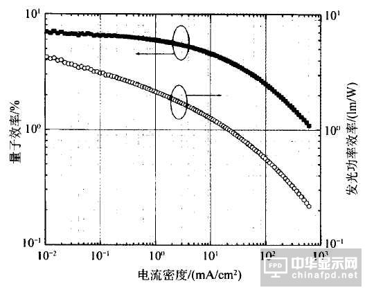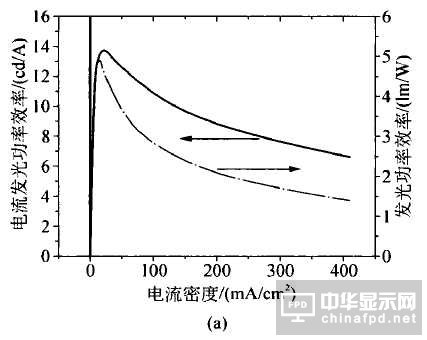 與紅色磷光OLED的發光功率效率與電流密度關系圖