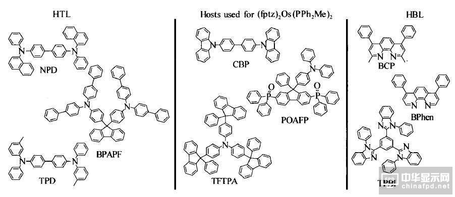 與(fptz)2 Os( PPh2Me)2 搭(da)配使用(yong)的(de)空穴傳輸層(HTL)材(cai)料(liao)、主體(ti)材(cai)料(liao)與空穴阻擋層(HBL)材(cai)料(liao)