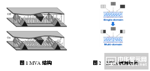 1997年富士通提出(chu)了MVA的(de)結構,如圖1所示(shi)(shi),在陣列和彩膜(mo)基板的(de)兩側做(zuo)出(chu)凸起(qi)結構。在初始狀態時,液(ye)晶分子(zi)垂直于凸起(qi)表面和基板表面排列,當施(shi)加電(dian)壓以后,液(ye)晶分子(zi)沿著電(dian)場線(xian)的(de)方(fang)向進行(xing)排列。因(yin)為子(zi)像素被(bei)分成(cheng)多(duo)個凸起(qi)的(de)區域,因(yin)此(ci)在子(zi)像素中形成(cheng)了多(duo)疇,也(ye)就是(shi)(shi)如圖2所示(shi)(shi)的(de)多(duo)視角(jiao)顯示(shi)(shi)。VA技術的(de)優(you)勢被(bei)開發出(chu)來,是(shi)(shi)VA模式(shi)重要的(de)里程(cheng)碑(bei)。