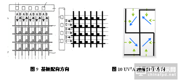 如(ru)圖(tu)(tu)9所示,分別對(dui)CF和(he)(he)ARRAY側的(de)一(yi)半(ban)子像素(su)的(de)PI進(jin)行(xing)曝光,同(tong)一(yi)子像素(su)內形成(cheng)(cheng)不(bu)同(tong)的(de)配(pei)(pei)向(xiang)(xiang)方(fang)向(xiang)(xiang),CF和(he)(he)ARRAY側基(ji)板的(de)配(pei)(pei)向(xiang)(xiang)方(fang)向(xiang)(xiang)需要旋轉90度。G6因(yin)為基(ji)板尺(chi)寸較小,所以,需要的(de)UV MASK數量較少。最終如(ru)圖(tu)(tu)10所示,液晶分子形成(cheng)(cheng)一(yi)定(ding)的(de)配(pei)(pei)向(xiang)(xiang)角(jiao)度,并(bing)因(yin)邊(bian)緣、配(pei)(pei)向(xiang)(xiang)不(bu)同(tong)區(qu)域(yu)出現一(yi)定(ding)黑紋。