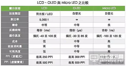 承繼了LED的特性,Micro LED優點包括低功耗、高亮度、超高分辨率與色彩飽和度、反應速度快、超省電、壽命較長、效率較高等,其功率消耗量約為LCD的10%、OLED的50%。而與同樣是自發光顯示的OLED相較之下,亮度比其高30倍,且分辨率可達1500PPI(像素密度),相當于Apple Watch采用OLED面板達到300PPI的5倍之多,另外,具有較佳的材料穩定性與無影像烙印也是優勢之一。