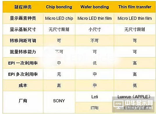 對于半導體與芯片的制程微縮目前已到極限,而在制造上的微縮卻還存在相當大的成長空間,對于Micro LED制程上,目前主要呈現分為三大種類:Chip bonding、Wafer bonding和Thin film transfer。