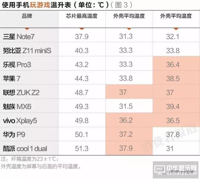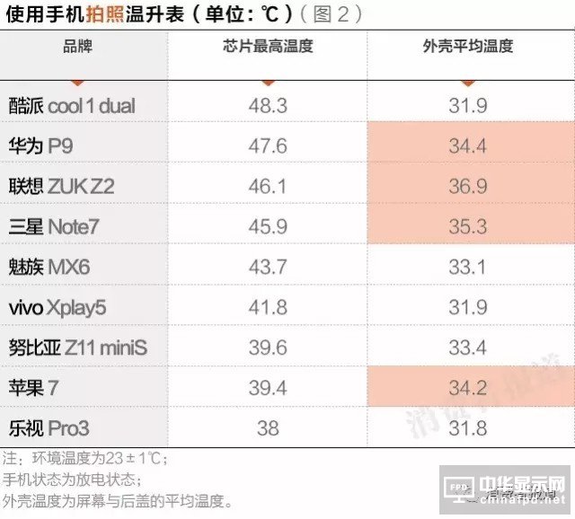 在“放電+游戲”環節,最高的華為P9(49.3℃)與最低的三星Note7(31.9℃)竟相差了17.4℃,這個溫度差距十分明顯。