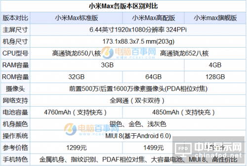 而上一代小米Max版本相對較多,包含了三個版本,包括標準版、高配版和旗艦版,各版本差異也相對復雜一些,主要是處理器、內存、存儲、價格四個方面的區別,具體區別如下圖所示。