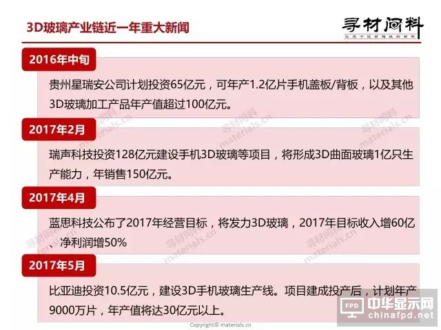 2016年中旬,貴州星瑞安計劃投資65億;2017年2月,瑞聲科技投資128億;2017年5月,比亞迪投資10.5億,都是手機3D玻璃相關項目。行業人士預測,2018年全球智能手機出貨量為15.5億支,3D玻璃蓋板滲透率達到25%,約為3.9億片,未來市場空間巨大!