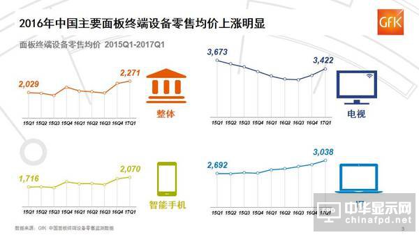 伴隨中國消費升級和上游原材料的價格的上漲,零售市場正逐步向中高端方向發展。GfK中國面板終端設備零售監測數據顯示,截止至2017年第1季度,主要面板終端設備的零售均價皆有不同程度的上漲。
