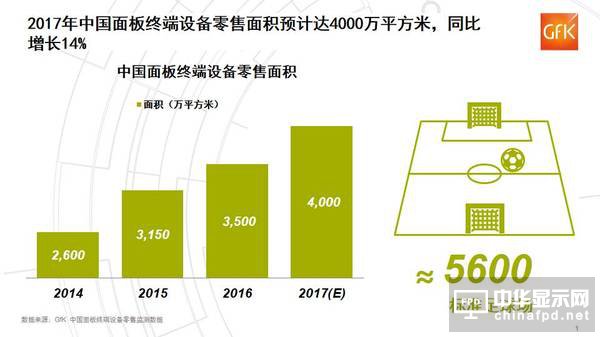 GfK數據顯示,2016年中國面板終端設備零售面積達3500萬平方米,隨著上游產能的逐步增加以及零售市場平均尺寸的不斷提升,預計2017年零售面積有望突破4000萬平方米,同比增長14%,相當于5600個標準足球場大小。
