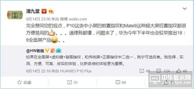 不過,現在似乎目前業內還沒有找到全面屏手機正面指紋解鎖的完美解決方案,所以即便榮耀Note 9確實采用了全面屏設計的話,那么指紋識別的位置也應該會如三星GALAXY S8系列那樣設計在手機的背面。而也正是這個話題,才引發了@潘九堂披露華為下半年較早推出全面屏新機的爆料。