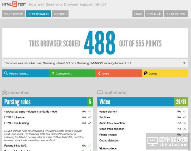 根據國外網站SamMobile的報道稱,在瀏覽器性能測試網站Html5Test已經出現了一款型號為SM-N950F的三星新機,并且從型號上推測有可能便是三星GALAXY Note 8的歐版型號。而從公布的數據來看,這款用于測試瀏覽器性能的三星GALAXY Note 8搭載的是Android 7.1.1系統,至于跑分則在滿分555分的情況下,摘得了高達488分的成績,相比現有的機型可謂表現出類拔萃。