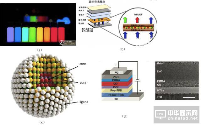 最(zui)(zui)常見的(de)(de)量(liang)(liang)(liang)子(zi)(zi)(zi)點(dian)結構如圖六(c)所示(shi),一(yi)般包含無機(ji)半(ban)(ban)導體(ti)核(he)心層(ceng)(ceng)(ceng)(ceng)(core,直徑約1~10nm)、寬帶(dai)隙無機(ji)半(ban)(ban)導體(ti)殼(ke)層(ceng)(ceng)(ceng)(ceng)(Shell),以及(ji)最(zui)(zui)外層(ceng)(ceng)(ceng)(ceng)的(de)(de)有(you)(you)機(ji)配體(ti)(Ligand),核(he)心層(ceng)(ceng)(ceng)(ceng)是(shi)量(liang)(liang)(liang)子(zi)(zi)(zi)點(dian)主(zhu)要發(fa)(fa)光(guang)層(ceng)(ceng)(ceng)(ceng),使(shi)(shi)用不同(tong)種類材料例如CdSe、CdS、InP與(yu)ZnSe ,合(he)(he)成不同(tong)的(de)(de)尺寸大(da)小,可以調整(zheng)量(liang)(liang)(liang)子(zi)(zi)(zi)點(dian)發(fa)(fa)光(guang)的(de)(de)顏(yan)色,利用合(he)(he)成的(de)(de)時間、溫度以及(ji)反應物的(de)(de)濃度,加上合(he)(he)成后的(de)(de)過濾篩選,可以使(shi)(shi)量(liang)(liang)(liang)子(zi)(zi)(zi)點(dian)的(de)(de)大(da)小更一(yi)致(zhi)且均勻,發(fa)(fa)出更純的(de)(de)光(guang)色。殼(ke)層(ceng)(ceng)(ceng)(ceng)包復核(he)心層(ceng)(ceng)(ceng)(ceng),隔絕氧氣與(yu)濕(shi)氣,并(bing)修補核(he)心層(ceng)(ceng)(ceng)(ceng)缺(que)陷,提升發(fa)(fa)光(guang)效率,最(zui)(zui)外層(ceng)(ceng)(ceng)(ceng)的(de)(de)有(you)(you)機(ji)配體(ti)可以使(shi)(shi)量(liang)(liang)(liang)子(zi)(zi)(zi)點(dian)分散(san)在(zai)不同(tong)的(de)(de)非極(ji)性(xing)有(you)(you)機(ji)溶(rong)劑中,有(you)(you)利于使(shi)(shi)用溶(rong)液制(zhi)程來制(zhi)作量(liang)(liang)(liang)子(zi)(zi)(zi)點(dian)發(fa)(fa)光(guang)器(qi)件(jian)。