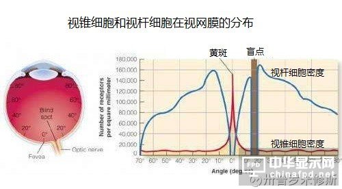 下圖是兩種細胞(bao)在視網膜(mo)上的(de)密(mi)度圖,能清晰地(di)看(kan)到視錐細胞(bao)尖(jian)銳的(de)集(ji)中在視覺最(zui)敏銳的(de)黃斑區(qu);而視桿細胞(bao)則在視網膜(mo)上攤大(da)餅式分布,在黃斑區(qu)反而基(ji)本沒有。