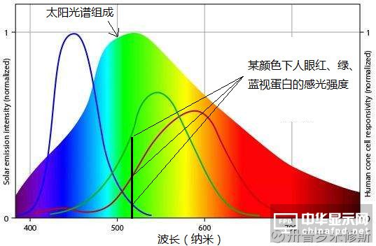 人類眼睛使用(yong)RGB感光系統,通(tong)過紅(hong)、綠(lv)、藍(lan)三種顏(yan)(yan)色(se)傳(chuan)感器(視(shi)錐細胞)來(lai)感受各(ge)種波(bo)長的(de)(de)光線(xian)(xian),不同顏(yan)(yan)色(se)的(de)(de)光線(xian)(xian)引起(qi)這(zhe)三個(ge)傳(chuan)感器的(de)(de)激發度(du)不同,大腦組合(he)這(zhe)些信息(xi)形(xing)成(cheng)意(yi)念中的(de)(de)顏(yan)(yan)色(se)。顯示面板就利用(yong)了(le)這(zhe)一點(dian),使用(yong)三個(ge)紅(hong)、綠(lv)、藍(lan)發光點(dian)組合(he)成(cheng)一個(ge)像(xiang)素點(dian),通(tong)過混色(se)產生(sheng)各(ge)種顏(yan)(yan)色(se)。客觀地說,由紅(hong)色(se)+綠(lv)發光點(dian)混色(se)產生(sheng)的(de)(de)“黃(huang)色(se)”光線(xian)(xian)(實(shi)際上是波(bo)長為(wei)(wei)500nm和700nm的(de)(de)兩種光線(xian)(xian)混在一起(qi))和單純(chun)的(de)(de)波(bo)長為(wei)(wei)570nm的(de)(de)黃(huang)色(se)光線(xian)(xian)是不同的(de)(de),但是在人眼看來(lai),他們(men)是一樣的(de)(de)。