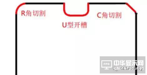 目前異形切割的主流方(fang)案是在屏(ping)幕(mu)面板上切兩(liang)個(ge)C角,兩(liang)個(ge)R角,一個(ge)U槽。該(gai)方(fang)案里(li)主要是圓弧切割,如(ru)若采(cai)用(yong)刀輪切割方(fang)案,則崩邊嚴(yan)重。