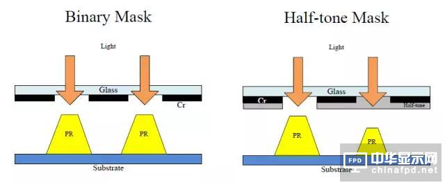 在使(shi)用時Cr 面與(yu)PR 膠接觸進(jin)(jin)行曝(pu)光。Photomask 可以進(jin)(jin)一步被分為(wei)Binary Mask 和Half-tone Mask(3):