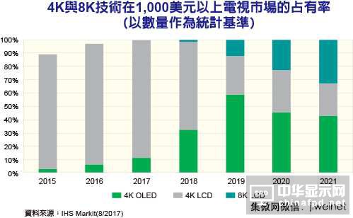 IHS預估,8K液晶電視或將在2018年開始上市,銷售主力為以65寸和75寸機種。初期65寸8K液晶電視價格會比65寸4K OLED電視貴35%,但隨著液晶面板廠65寸以上的產能快速擴增,價差會逐漸縮小,將使4K OLED電視出貨量占比受到壓制。