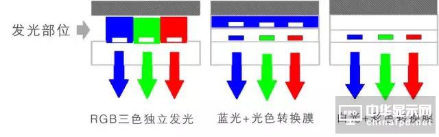 方式 | RGB 三色獨立發光 | 藍光+光色轉換膜 | 白光+彩色濾光片 |