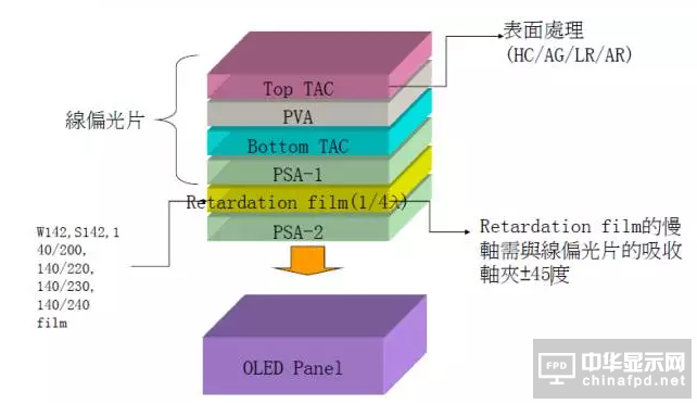 目前圓偏光(guang)片(pian)是(shi)以1/4波長相位(wei)膜與傳(chuan)統偏光(guang)片(pian)結合成(cheng)的抗反射片(pian)。