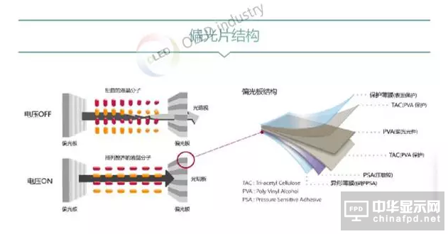 由偏光(guang)膜(PVA)、保護膜(TAC)、壓敏(min)膠層(ceng)、離型膜、保護膜、光(guang)學補(bu)償膜等符合而(er)成,基本結構(gou)是兩層(ceng)TAC膜夾一層(ceng)拉伸后的(de)PVA膜。