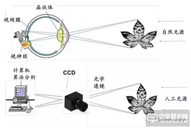 AOI 以人工光源代替自然光,以光學透鏡代替人眼晶狀體,以 CCD、CMOS 等元件進行圖像采集代替視網膜,最后經過算法處理將分析后的圖像與之前采集的標準圖像進行對比,利用圖像對比+模式分析的方法代替人腦的分析過程得到檢測結果。