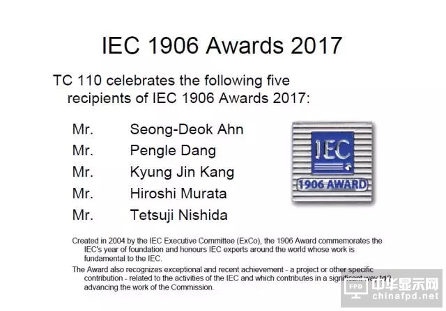 在本年度IEC/TC110年會上,維信諾標準負責人黨鵬樂獲頒IEC 1906獎。今年獲獎的共五位專家,他們分別來自中國、韓國和日本,黨鵬樂是唯一一位來自中國的專家。“IEC 1906獎”是IEC最重要的獎項之一,用以表彰對IEC國際電工標準化做出突出貢獻的各國技術專家。該獎項每年評選一次,由IEC各技術委員會的主席、秘書負責提名,經IEC中央辦公室技術官員審核后頒發。