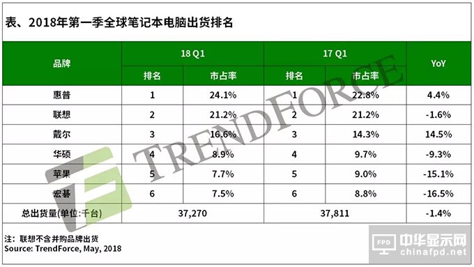 聯想近幾年受(shou)到大集團組織(zhi)更迭影響,出(chu)貨(huo)動能(neng)消散,第(di)(di)一季出(chu)貨(huo)僅790萬臺(tai),與去年同期相(xiang)比衰退1.6%。然而第(di)(di)二季由于公司內組織(zhi)改革大致底定,若(ruo)在接下來幾個季度能(neng)全力沖刺出(chu)貨(huo),無(wu)疑將帶動中國大陸筆電(dian)出(chu)貨(huo)表現。