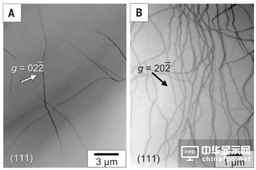 掃(sao)描透(tou)射電子顯微鏡下觀察(cha)不同(tong)狀(zhuang)態硫(liu)化鋅中的(de)位(wei)錯(A)原(yuan)始(shi)樣品(B)黑暗中變形后的(de)樣品,其中顏色(se)較深(shen)的(de)“蜿(wan)蜒細線”就是(shi)位(wei)錯。可明顯看出黑暗中樣品的(de)位(wei)錯更為密集。圖片(pian)來源:參考文獻[1]
